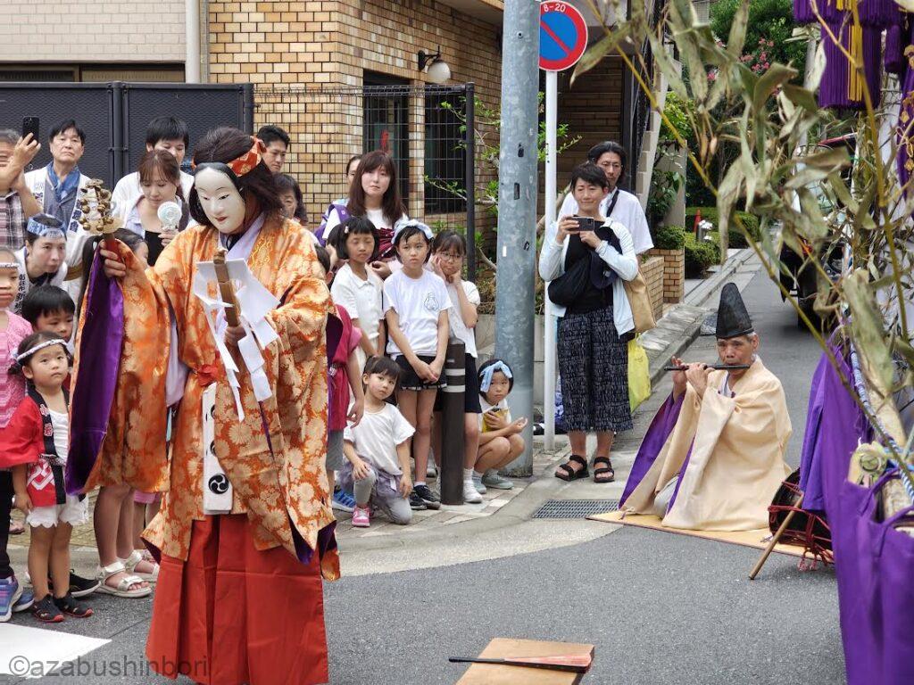 午後1時過ぎには、氷川神社の「宮神輿」が、トラックに乗せられて到着。初めて試みとして、神輿を前に、笛と太鼓の演奏に合わせ、巫女がお祝いの神楽(かぐら)を舞った。初めて実際の神楽を見た親子も多かったようで、みな楽しんでいた。
