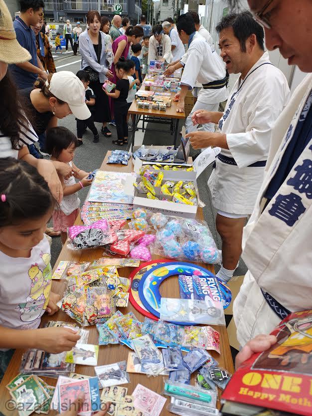 子ども神輿の後は福引だ。大当たりには鐘がなる。子どもたちは、賞品を抱えて、嬉しそうにかき氷を食べていた。