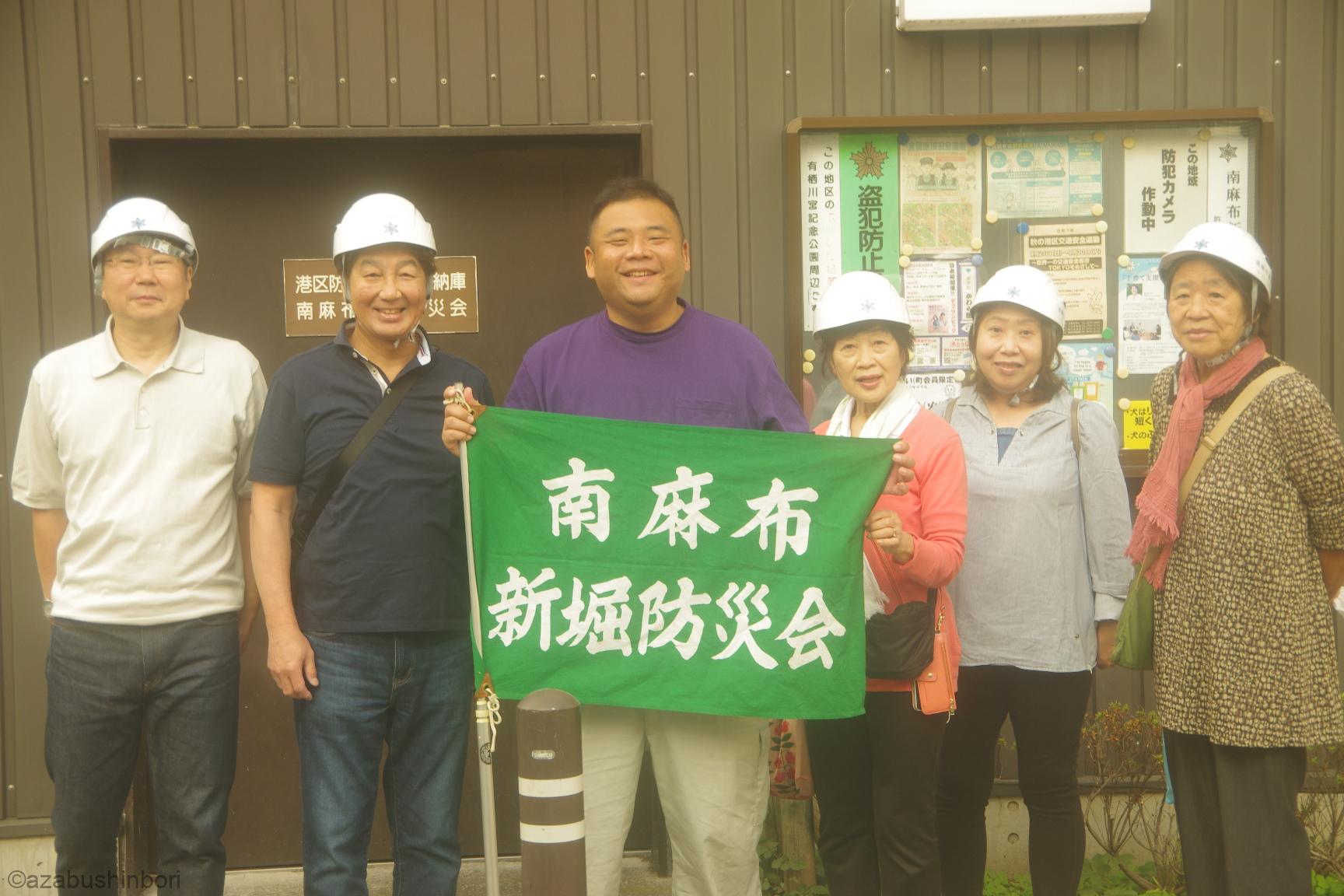 南麻布新堀会は11月19日午前、六本木中学校で開かれた港区総合防災訓練(麻布地区)に参加しました。8時50分に防災公園に集合し、新堀会の旗を掲げ、ロゴ入りのヘルメットをかぶって、10人で六中まで歩きました。